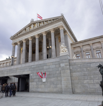 Figure with a horse sculpture in front of the Austrian parliament building.